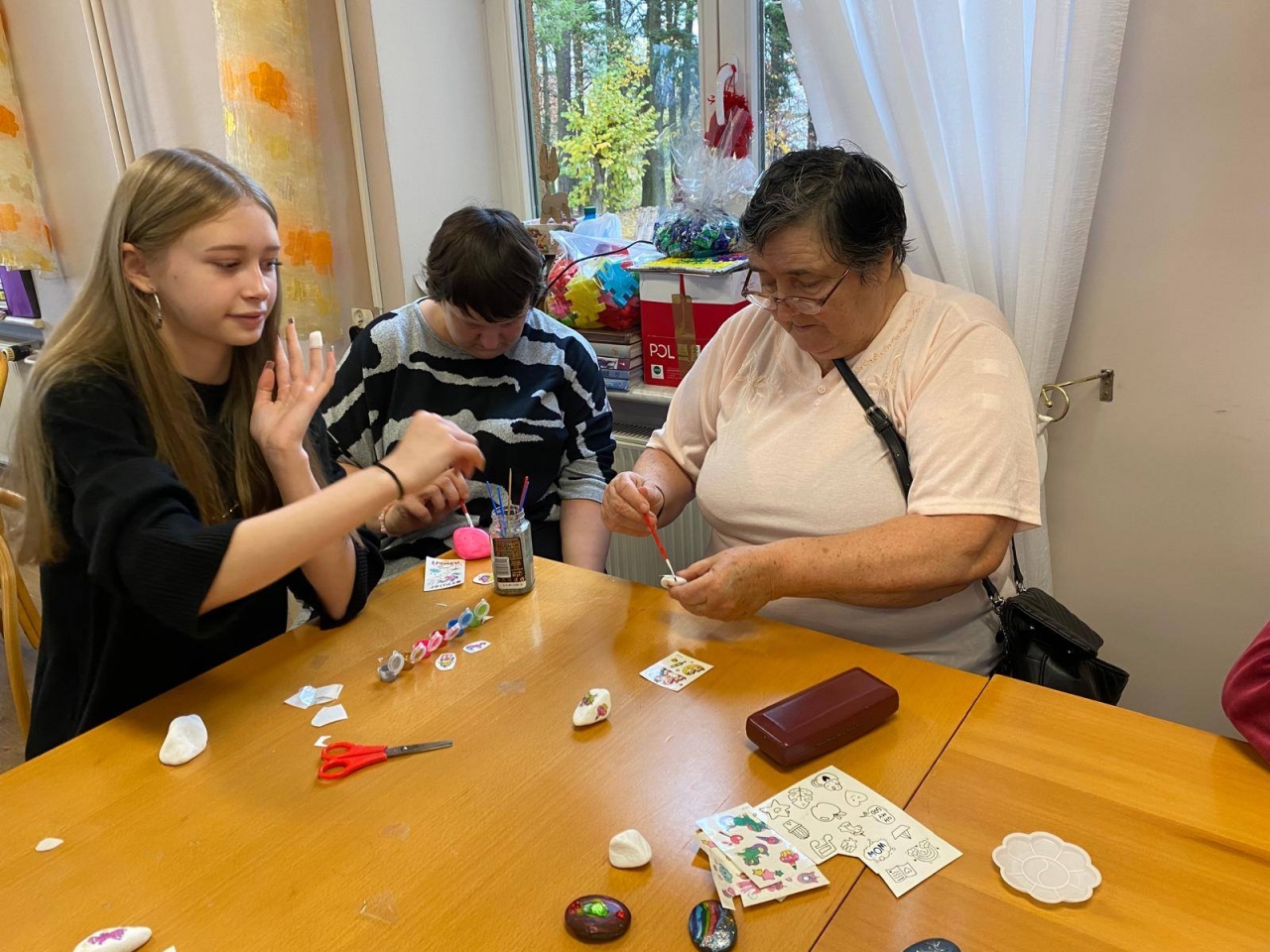 Podczas spotkania nasi wolontariusze zaprezentowali własny program artystyczny, w którym nie zabrakło muzyki na żywo, Igor zagrał na trąbce, a Ola na skrzypcach. Kolejnym punktem programu były warsztaty, podczas których powstały kamienie z pozytywnym przesłaniem. Spotkanie zakończyliśmy wspólnym śpiewem utworu „Tolerancja” Stanisława Sojki.