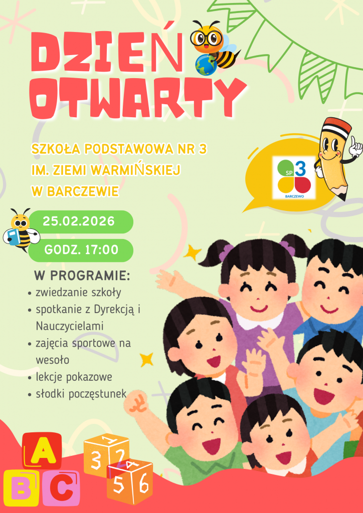 Serdecznie zapraszamy Was na Dzień Otwarty w Szkole Podstawowej nr 3 im. Ziemi Warmińskiej w Barczewie, który odbędzie się 25.02.2026r. o godzinie 17:00 w naszej szkole.
